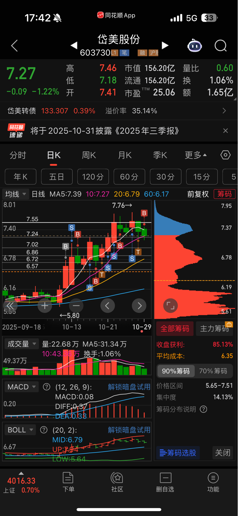 $岱美股份(SH603730)$ 调整了5天,向上压力位7.35、7.55、7.76、8元