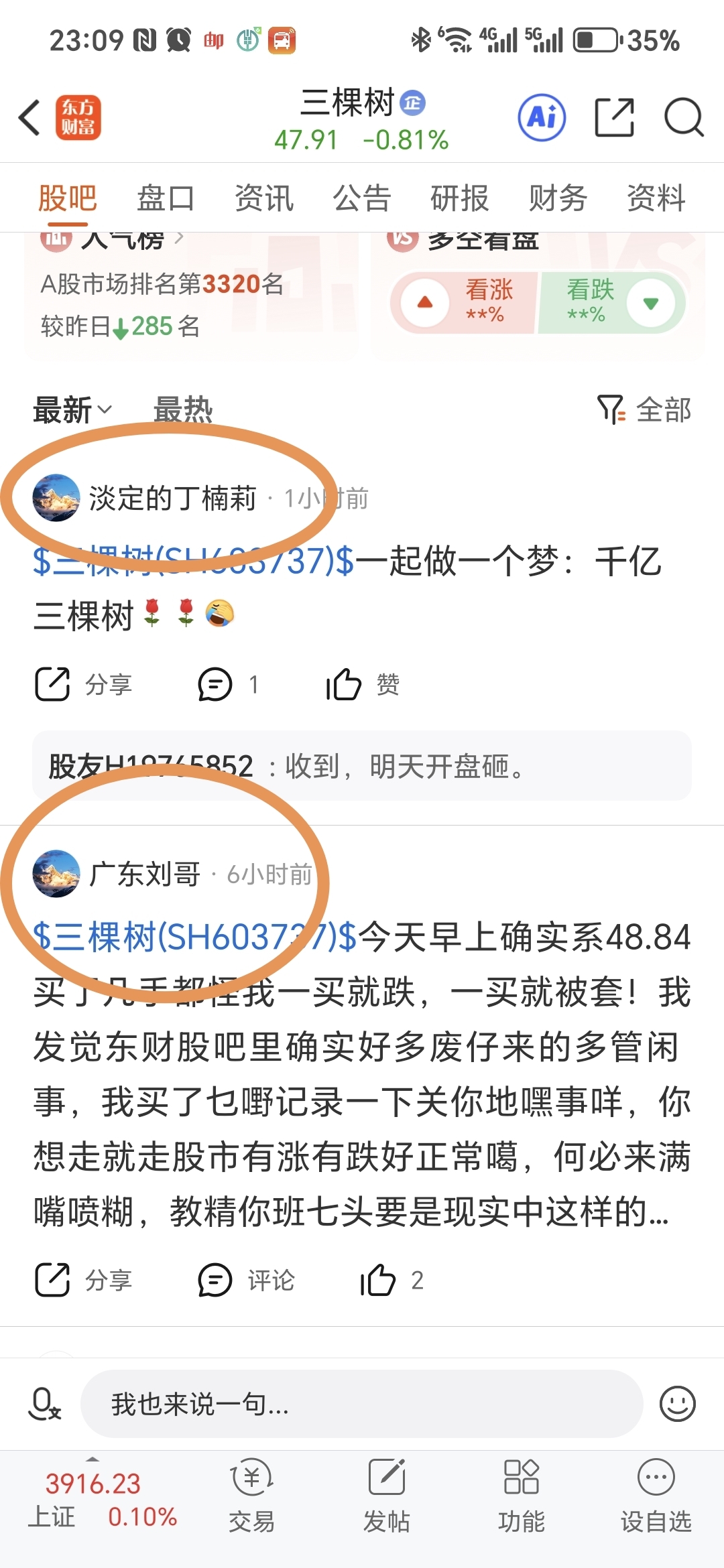 $三棵树(SH603737)$ @广东刘哥 @淡定的丁楠莉 为什么你俩头像一模一样???是不是一个人两个号,轮流唱多?