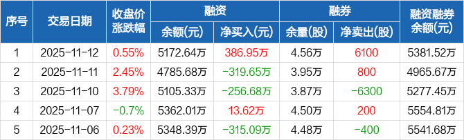 三棵树:融资净买入386.95万元,融资余额5172.64万元(11-12)