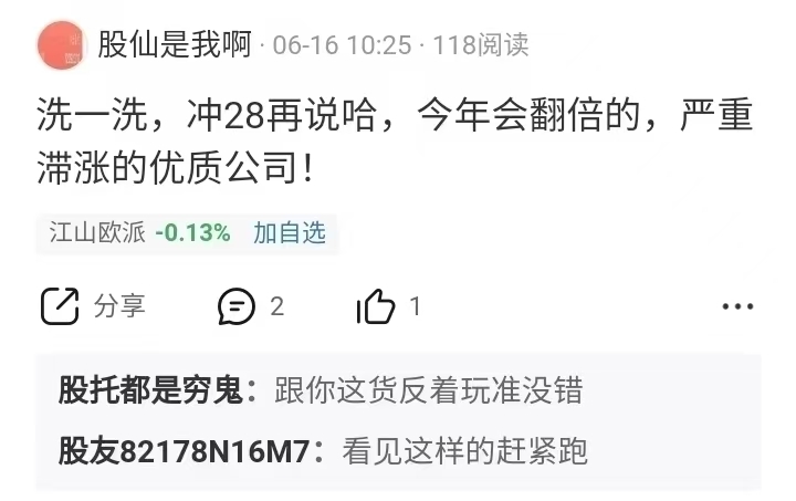 温馨提示: 1.根据《证券法》规定,禁止编造、传播虚假信息或者误导性信息,扰乱证券市场;2.用户在本社区发表的所有资料、言论等仅代表个人观点,与本网站立场无关,不对您构成任何投资建议。用户应基于自己的独立判断,自行决定证券投资并承担相应风险。《东方财富社区管理规定》