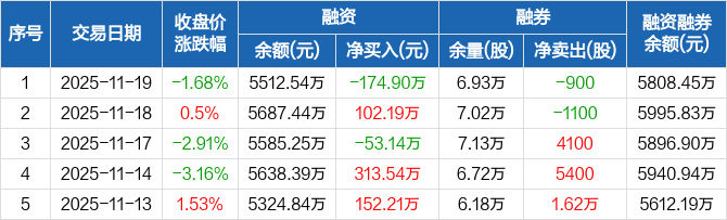 融资方面,当日融资买入252.82万元,融资偿还427.72万元,融资净偿还174.9万元。融券方面,融券卖出800股,融券偿还1700股,融券余量6.93万股,融券余额295.91万元。融资融券余额合计5808.45万元。