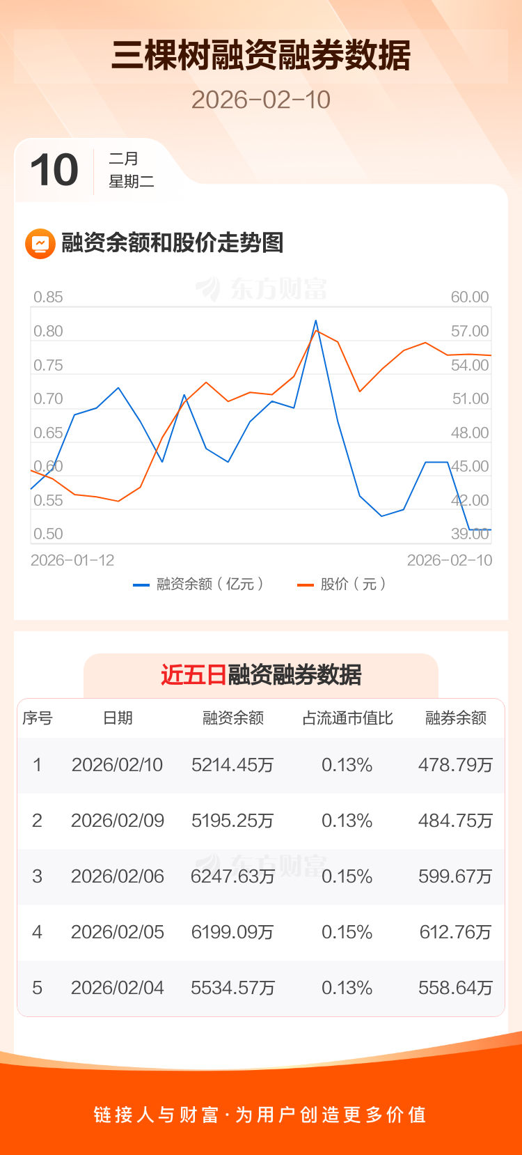 交易所最新数据显示,三棵树于2026年2月10日获融资买入533.46万元,融资偿还514.26万元,当日融资净买入19.2万元。目前,该股融资余额5214.45万,占流通市值比例为0.13%。