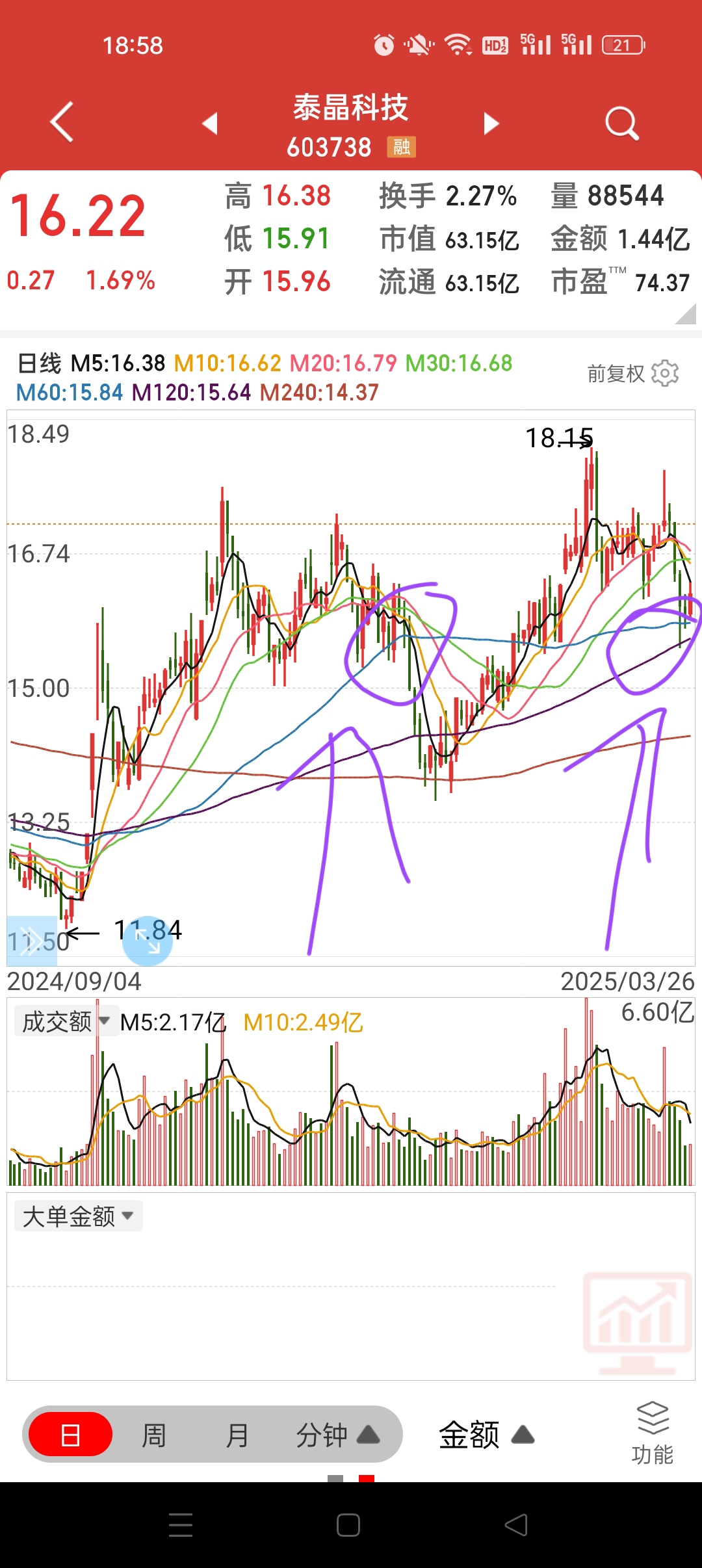 $泰晶科技(SH603738)$ 理论上还有比较大的跌幅,均线位置不足以支撑,,,但是考虑到特殊背景上冲3400指数关口,,。均线杀破有待确认,,防一手,不能把所有仓位打进去。万一杀破,等下一个均线支撑就是企稳,,下一浪反弹,所以手里不能没有现金流,