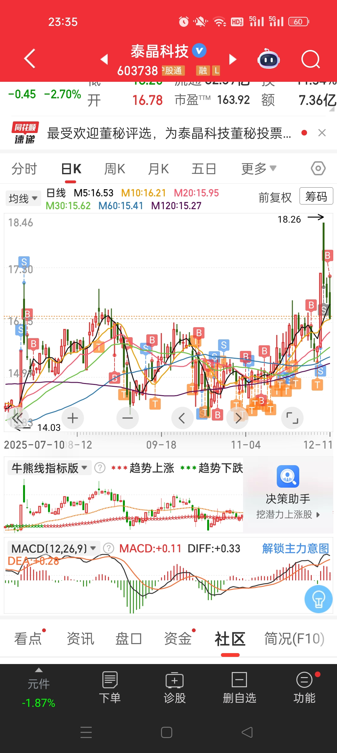 $泰晶科技(SH603738)$ 死磕,目前重新建立头寸,只要向上拉,不排除再次清仓,,明天我看是反弹,绝对不是反转