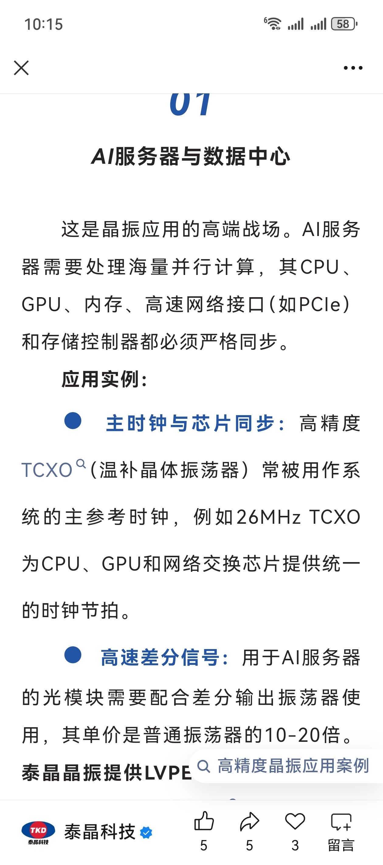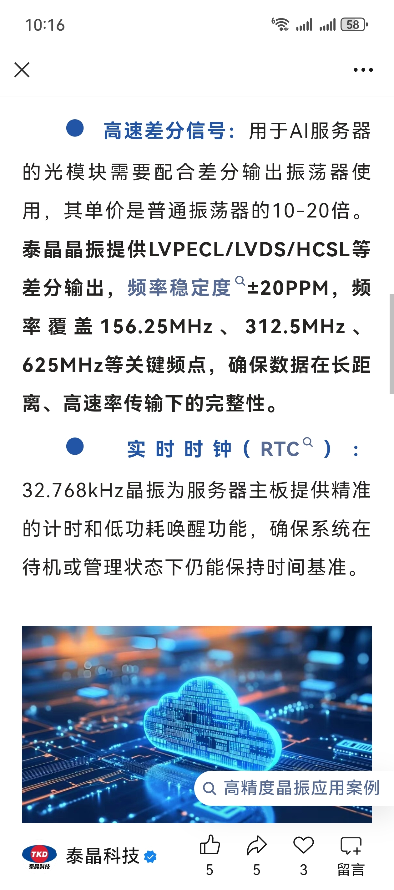 泰晶公众号出了一个重仓新闻,首次公开了其差分晶振的单价是普通晶振的20倍,还有脑