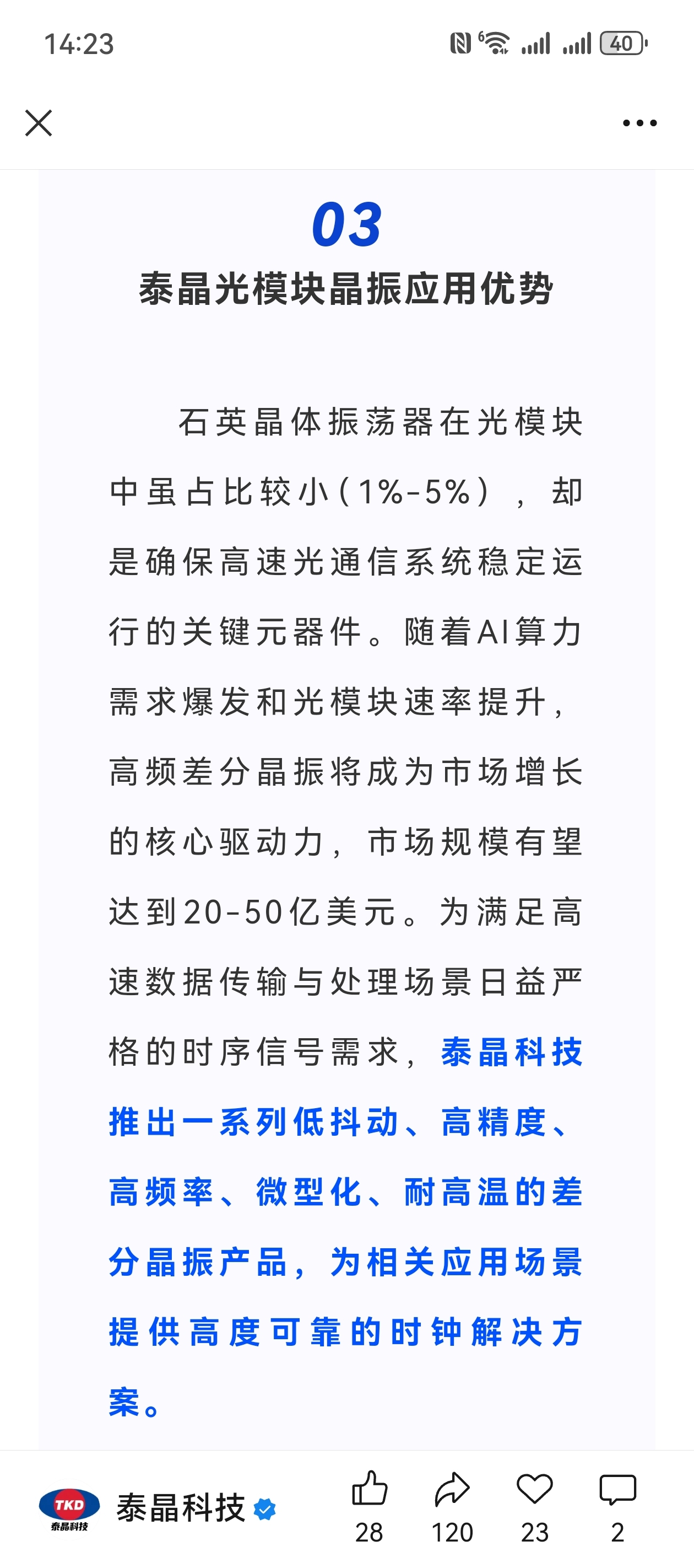 $泰晶科技(SH603738)$ 这有泰晶自己家官网说的超高频差分晶振的市场规模预测,某位股友问我泰晶的超高频差分晶振的市场有多大这个问题的终极答案,其实这个说法比较保守,按照目前下游的需求和超高频差分晶振的市场价格可能会达到100亿美元以上,按照目前算力基建的增速,未来5年全球超高频差分晶振各种型号的需求可能超过50亿颗以上,按照超高频目前不同型号从10-100元的市场价格计算取一个最保守的30元均值也是过百亿美元,因为其实未来的L4智能汽车对超高频差分晶振需求可能会超过光模块,关键是最大的市场在中国,对超高频差分晶振的需求中国就已经占全球6成以上,因为AI算力产业链的上游产业集群本来就在中国,而中国能够吃到这块超级蛋糕的自然是泰晶,目前泰晶面临最大的问题就是产能释放,下游市场已经爆了,而上游的产能需要时间,泰晶之前在重庆垫江注册了晶芯频控这个基地产能相当于又造了一个同等规模的泰晶,不过当时是为了车规的国产替代,如今AI算力的基建狂潮让泰晶的重庆智能工厂可能重点会全力保障超高频差分晶振这条产品线的产能