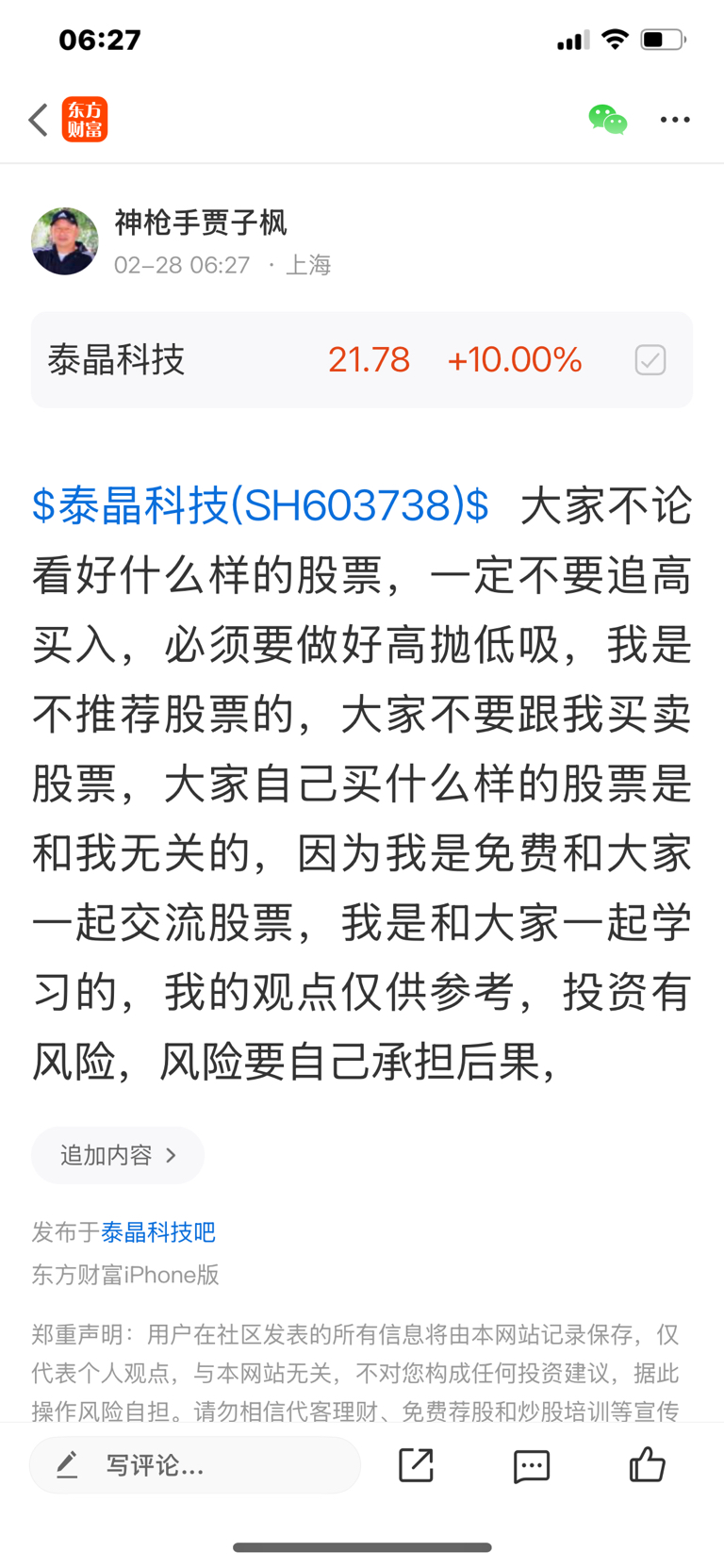 $泰晶科技(SH603738)$ 这个股是我二月二十八号发表文章看涨的股票,我是不推荐股票的,大家不要跟我买卖股票,大家自己买什么样的股票是和我无关的,因为我是免费和大家一起交流股票,我是和大家一起学习的,我的观点仅供参考,投资有风险,风险要自己承担后果,
