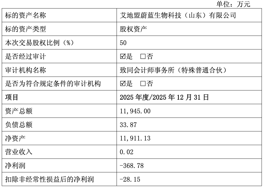 交易标的财务数据显示,艾地盟蔚蓝2025年净利润为-368.78万元,扣非净利润为-28.15万元。截至2025年12月31日,艾地盟蔚蓝负债总额为33.87万元。