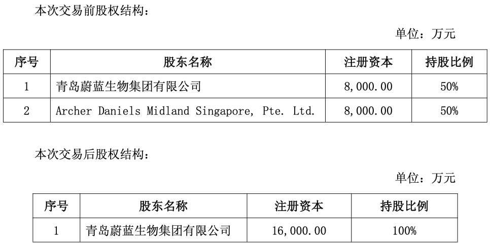 2022年3月31日,蔚蓝生物集团与ADM Singapore签署了《重述之股东协议》,潍坊蔚之蓝生物科技有限公司后更名为艾地盟蔚蓝生物科技(山东)有限公司。艾地盟蔚蓝的注册资本为16,000万元人民币,双方的持股比例各为50%。截至本公告日,双方已分别实际缴付注册资本7000万元。