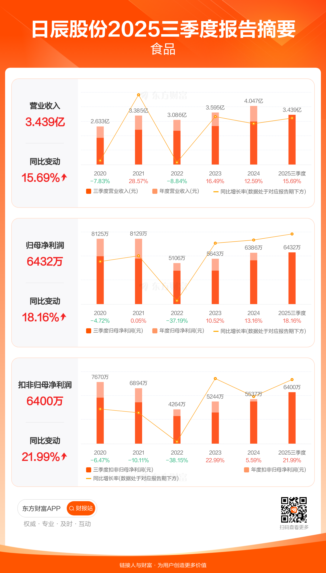 日辰股份10月29日发布2025年三季报显示,公司前三季实现营业收入3.44亿元,同比增长15.69%;归母净利润6431.75万元,同比增长18.16%;扣非归母净利润6399.56万元,同比增长21.99%。