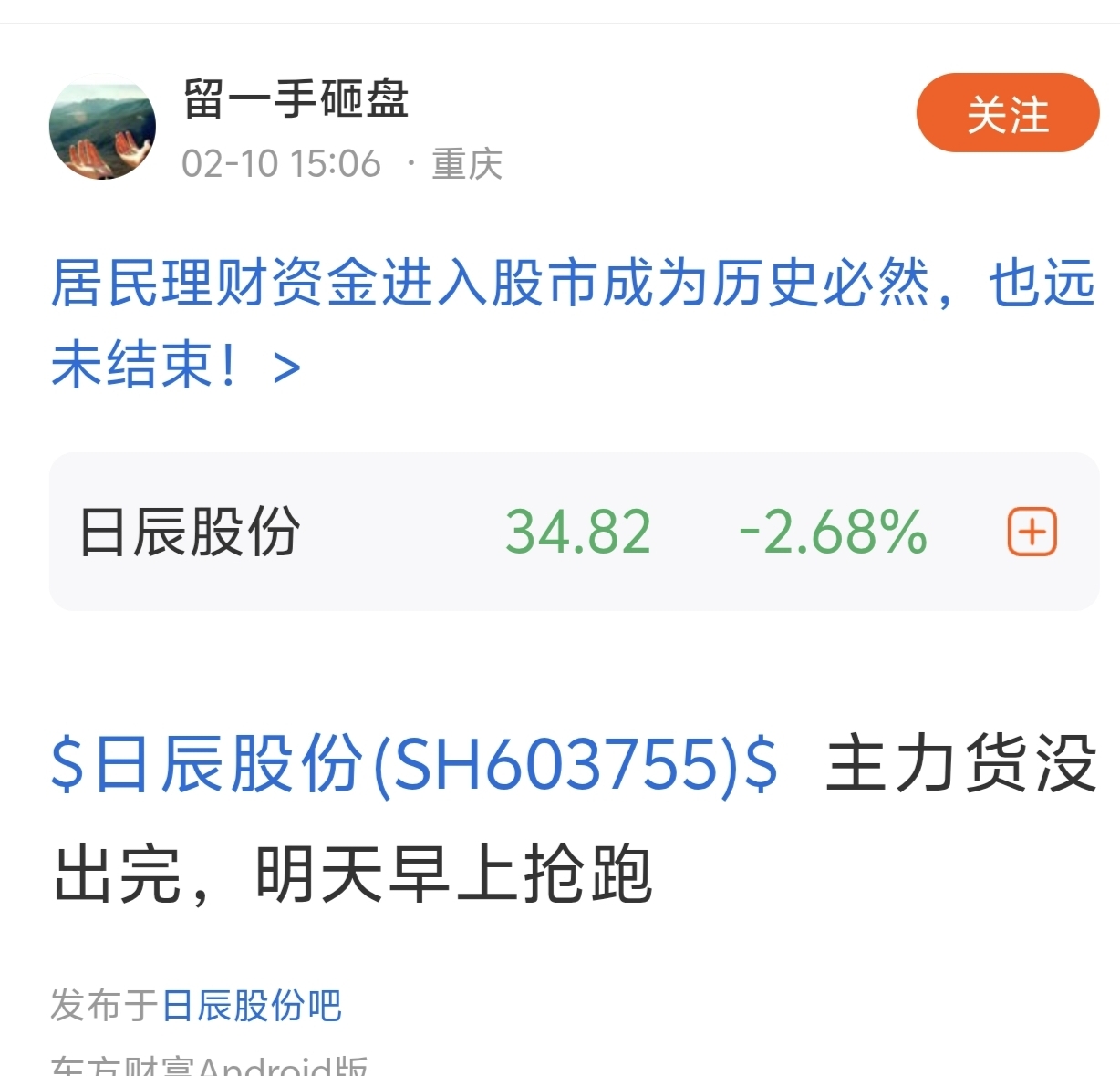 温馨提示: 1.根据《证券法》规定,禁止编造、传播虚假信息或者误导性信息,扰乱证券市场;2.用户在本社区发表的所有资料、言论等仅代表个人观点,与本网站立场无关,不对您构成任何投资建议。用户应基于自己的独立判断,自行决定证券投资并承担相应风险。《东方财富社区管理规定》