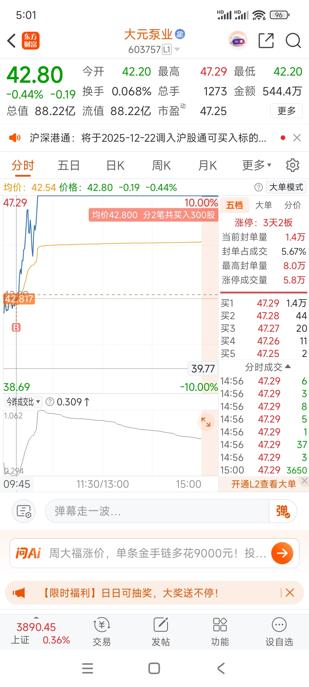 $大元泵业(SH603757)$ 借了2个朋友的钱,全仓杀入,周二三板卖出,把钱还给朋友