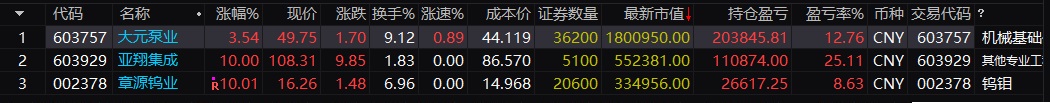 继续持仓中:大元泵业、亚翔集成、章源钨业