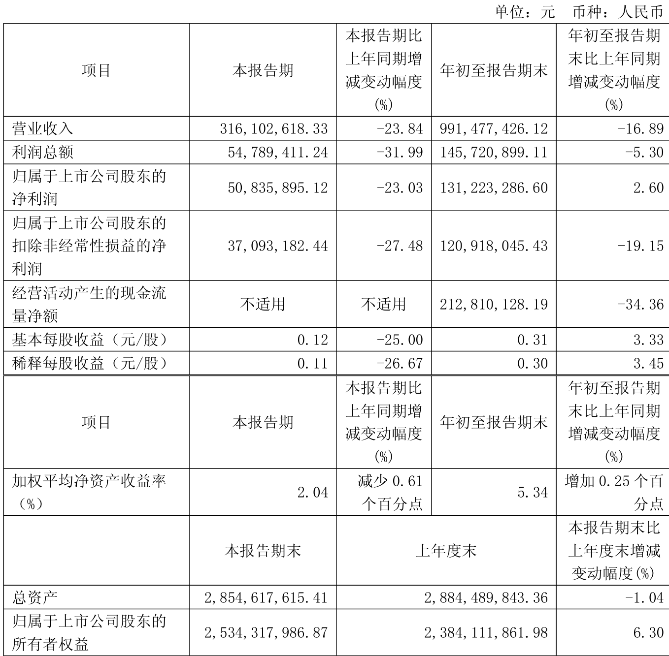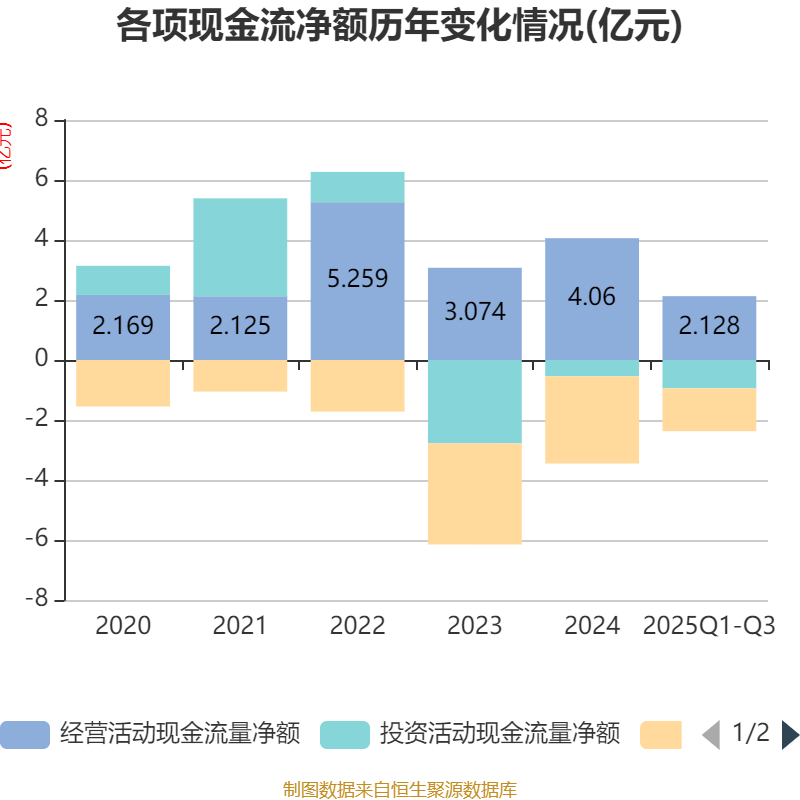 2025年前三季度,公司经营活动现金流净额为2.13亿元,同比下降34.36%;筹资活动现金流净额-1.43亿元,同比增加1.49亿元;投资活动现金流净额-9424.53万元,上年同期为-1.09亿元。