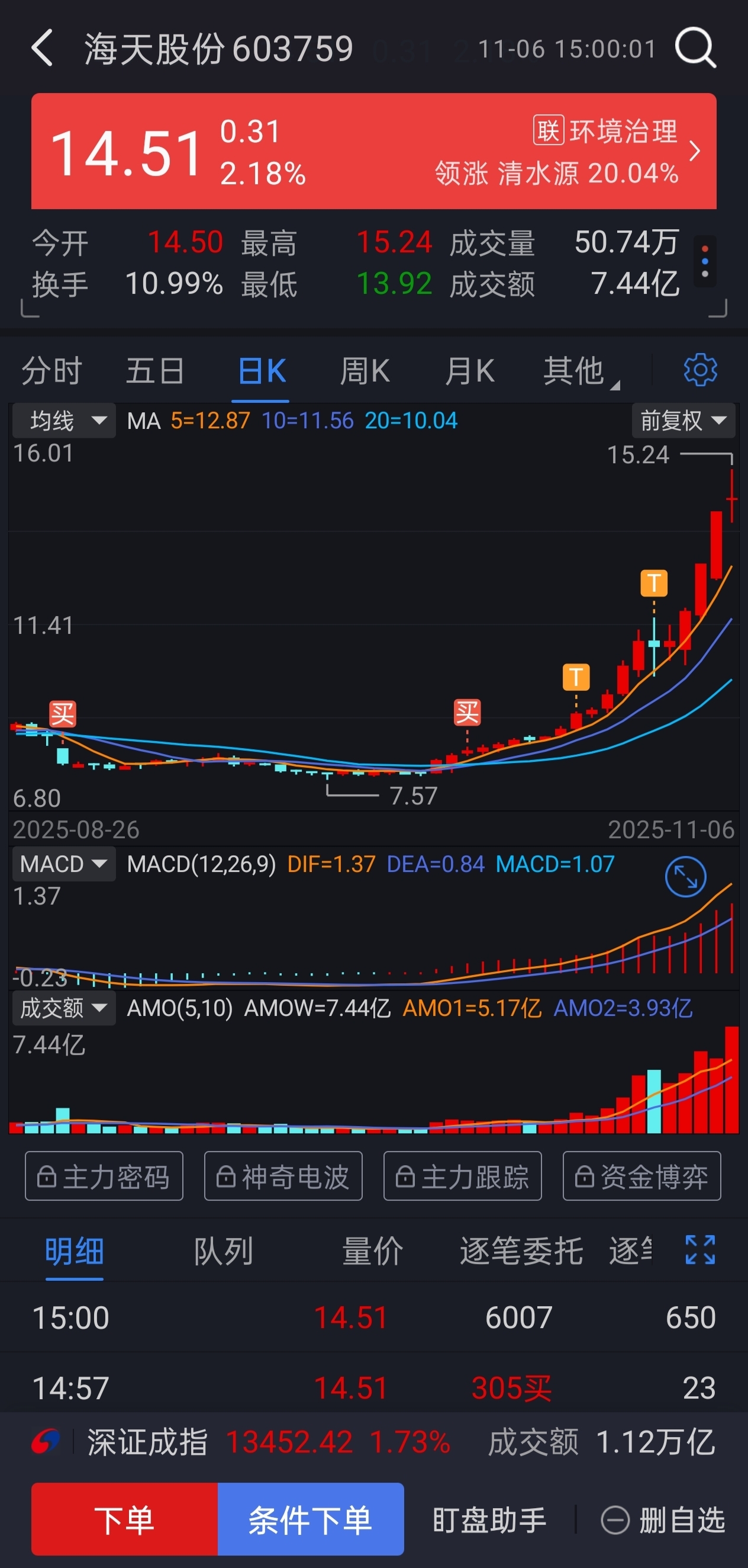 $海天股份(SH603759)$ 今天到底是主力洗盘还是出货无从得知,你知道的是主力流出了3000多万,如果明天走弱,绿盘收必清仓走人,坚决做到知行合一,也不枉我取的这个名字。
