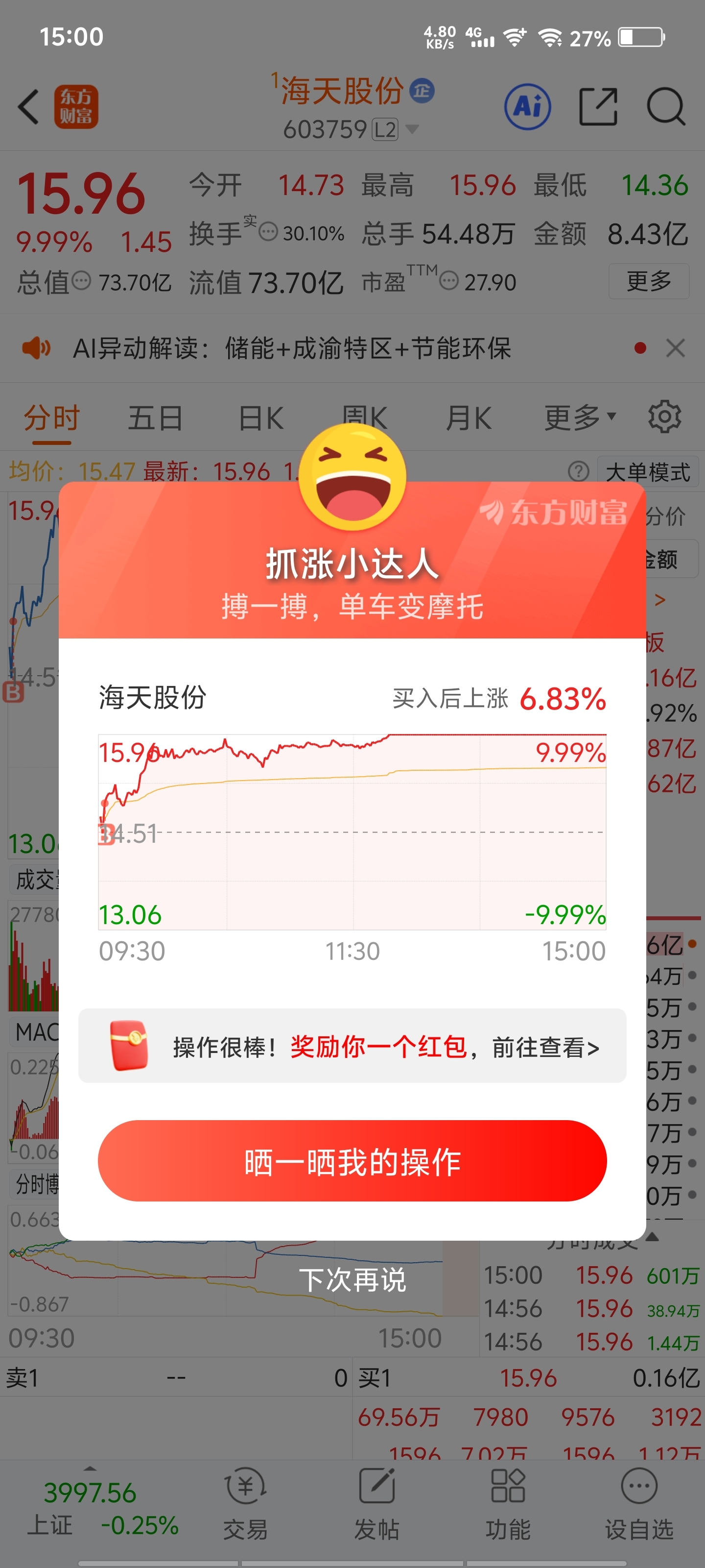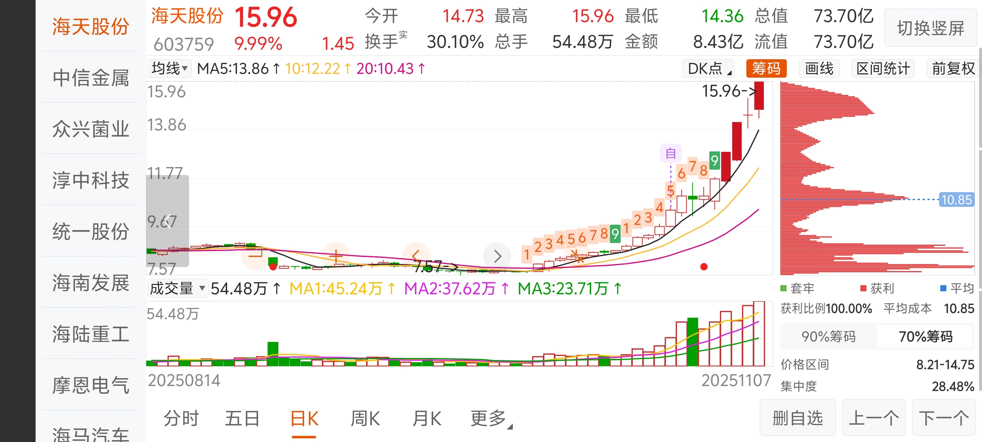$海天股份(SH603759)$ $海马汽车(SZ000572)$ $海陆重工(SZ002255)$ 早盘多次提示海天股份的机会,有多少人买进了?海天股份与振德医疗一样,典型大牛股大趋势股走势!而且还是海字辈