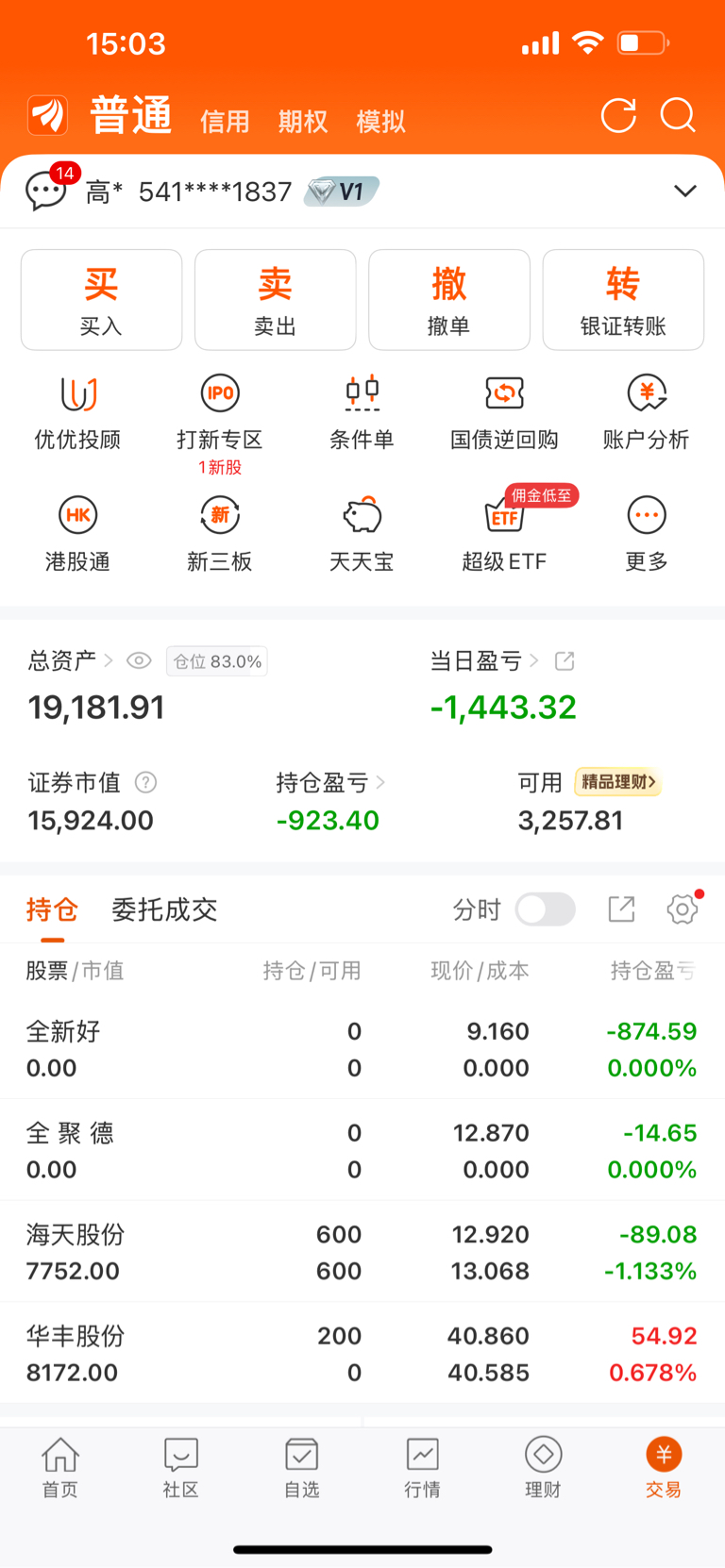 $海天股份(SH603759)$ 亏大了,刚炒股几天,仓位太重了,卖都卖不出去,三万的本金,快亏没了