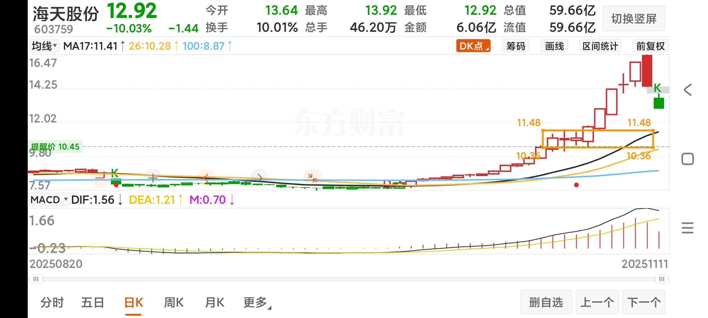 $海天股份(SH603759)$ 会回踩这个区间!是形成回踩确认还是在进入不知道!估计是回踩确认概率大!
