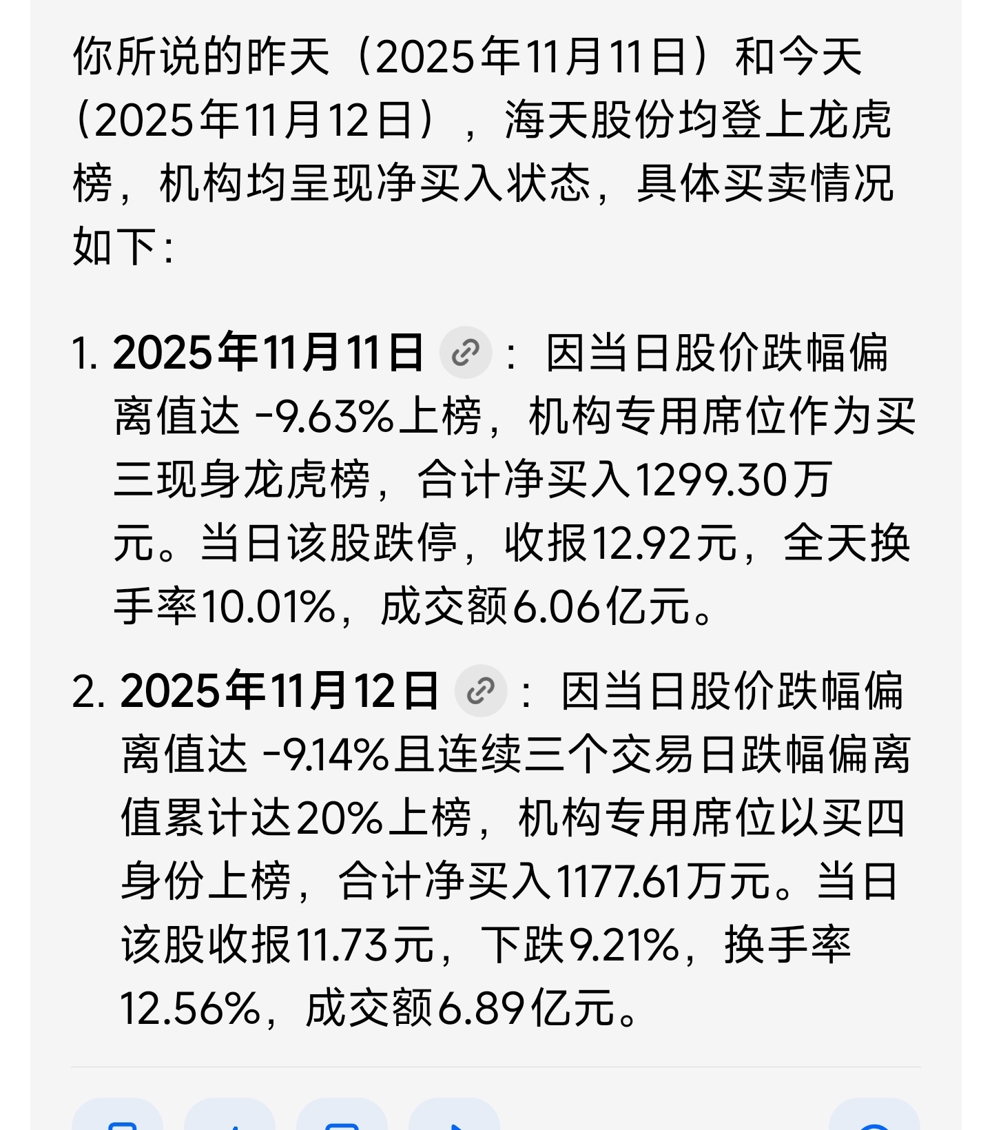 $海天股份(SH603759)$ 11月11日12日两天机构买卖情况