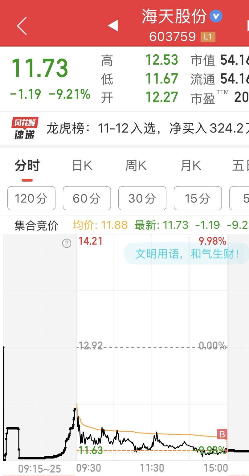$海天股份(SH603759)$ 尾盘11.73全仓梭哈,撑死胆大,明日见分晓