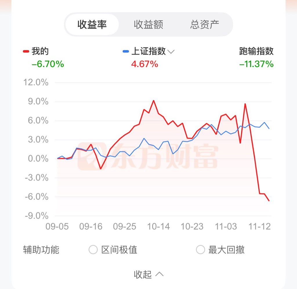 我最近是买啥跌啥,每次稍赚一点就会大跌。本来上周五账户还是赚了一点,这周连亏一整