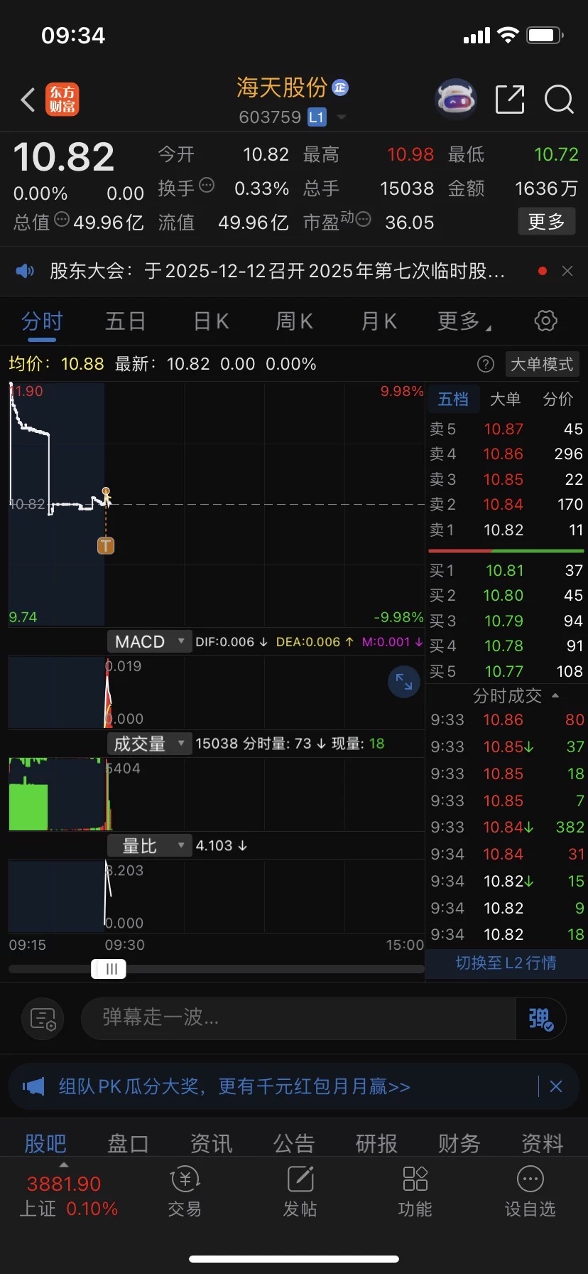 速度太快,不提前挂单根本无法成交10.73元买入,10.98元卖出,做个T挺好