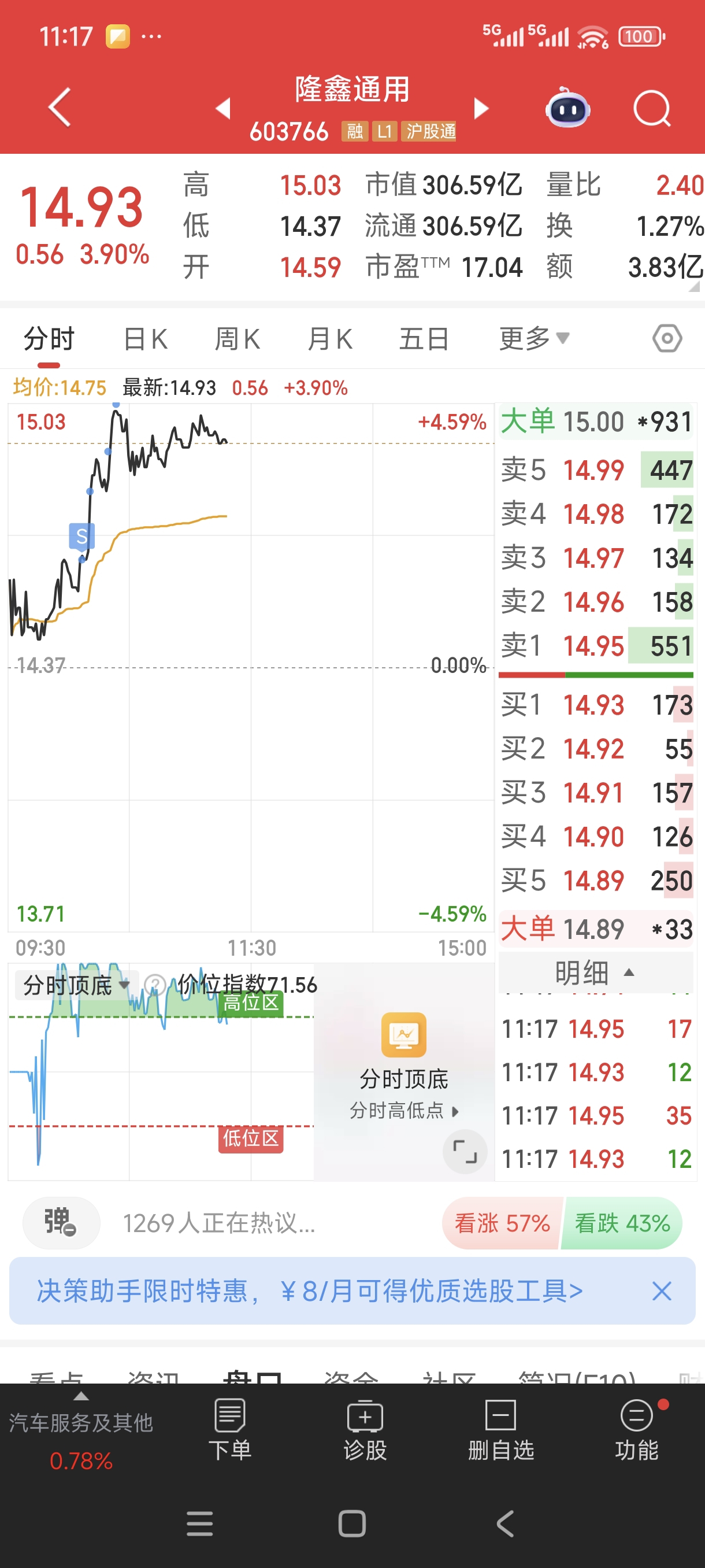$隆鑫通用(SH603766)$ 兄弟们年底了我先减点仓位,没有砸盘顺势温柔出了点点,再接再厉再创辉煌