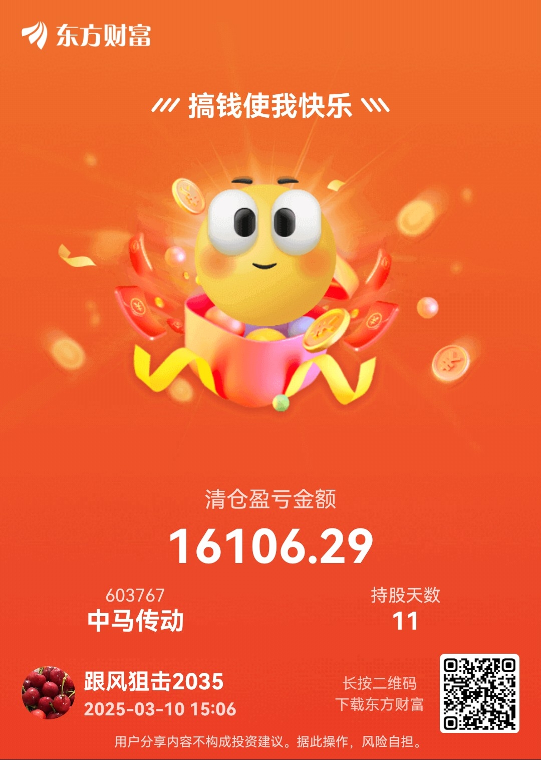 $中马传动(SH603767)$ 清仓了,老庄太磨人了,但是今天还算够意思了,大盘这样环境居然没有砸盘,赚了一点点满足了。