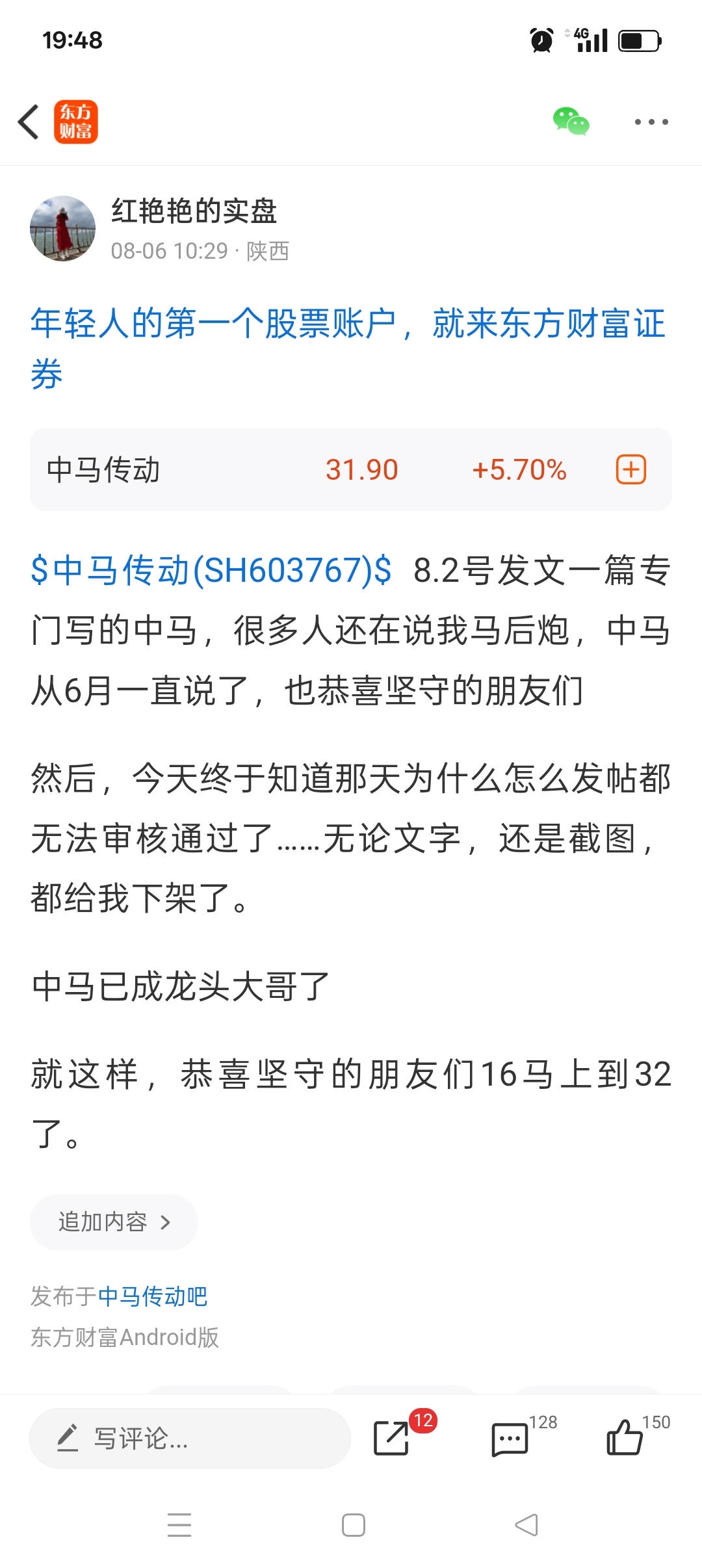 目标价都写出来了,还有之前很早写的向23突破,别再问我怎么办了,如果被套了也别找我。还有万里马15进场的宝子,你们想一想是为什么要15进场,你总不能也32去买中马吧?反正大涨过后剩下的也就是减仓,清仓。万里马等9月初应该还有一波,到时候你们追高的就跑。