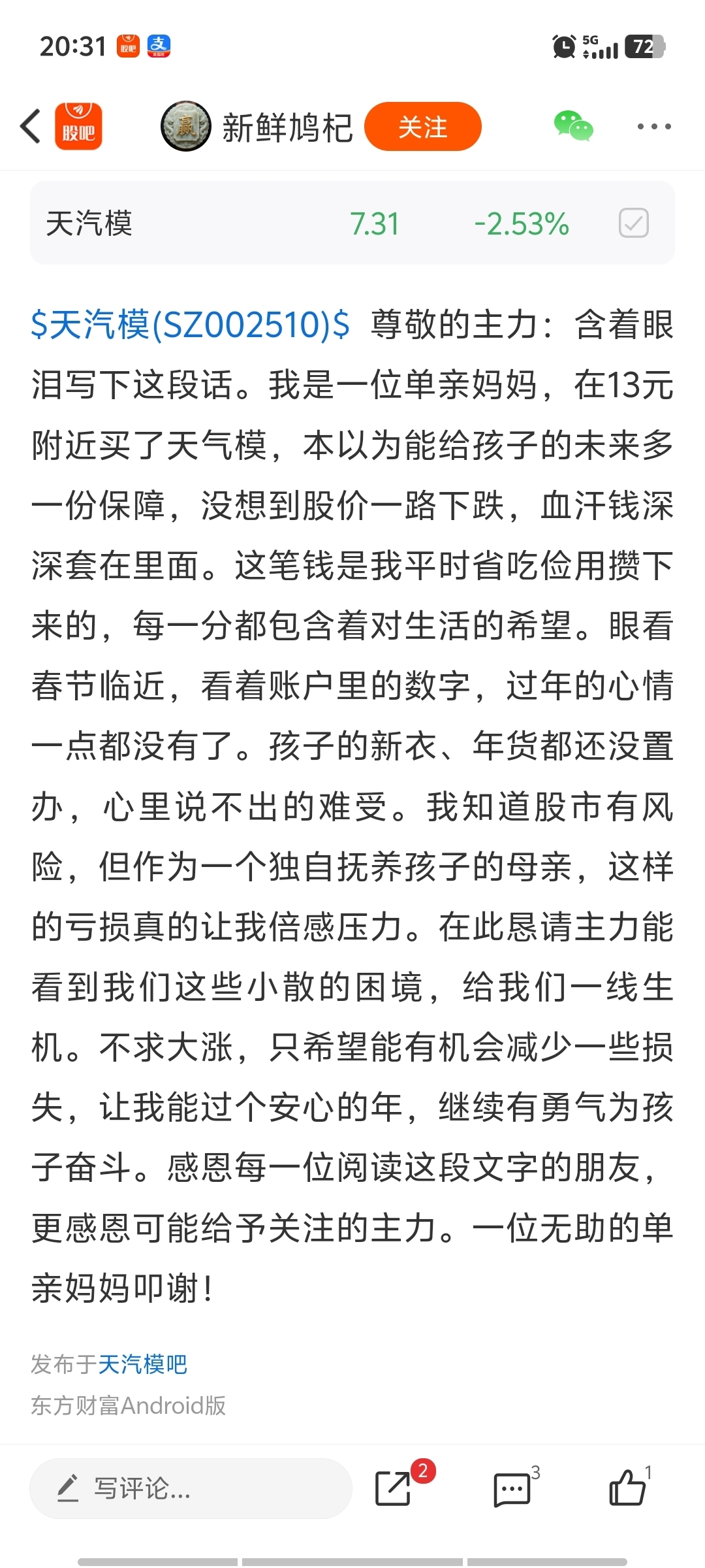 温馨提示: 1.根据《证券法》规定,禁止编造、传播虚假信息或者误导性信息,扰乱证券市场;2.用户在本社区发表的所有资料、言论等仅代表个人观点,与本网站立场无关,不对您构成任何投资建议。用户应基于自己的独立判断,自行决定证券投资并承担相应风险。《东方财富社区管理规定》
