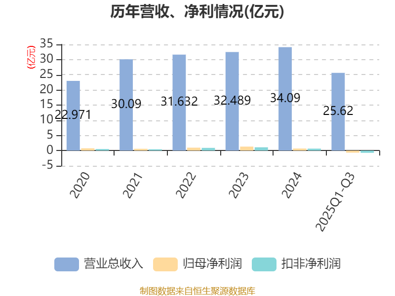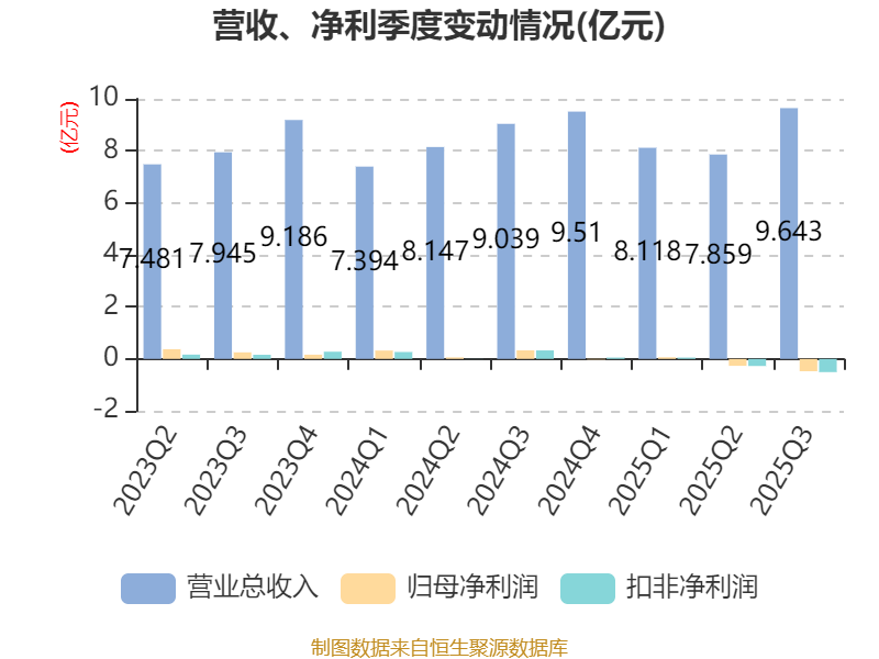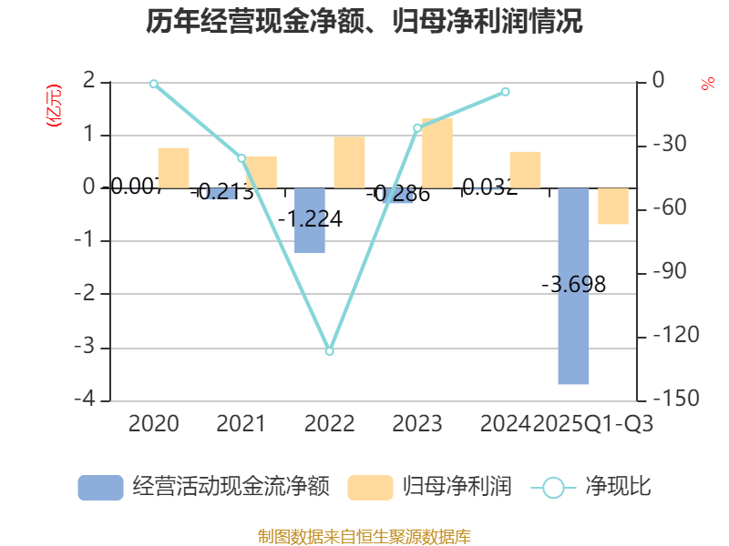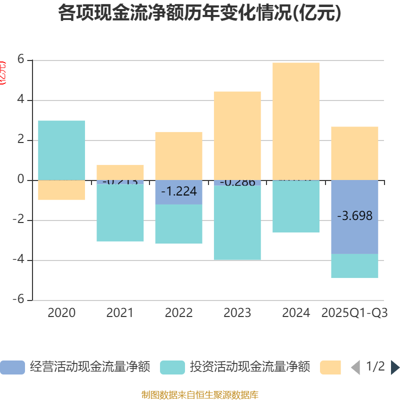 2025年前三季度,公司经营活动现金流净额为-3.7亿元,同比减少2.32亿元;筹资活动现金流净额2.67亿元,同比减少3.36亿元;投资活动现金流净额-1.2亿元,上年同期为-2.59亿元。