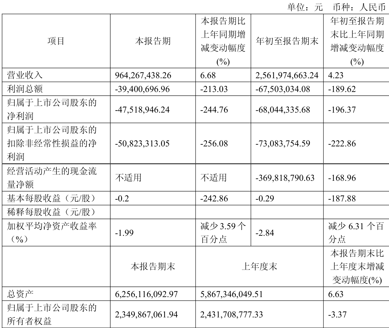 中证智能财讯常青股份(603768)10月31日披露2025年第三季度报告。前三季度公司实现营业总收入25.62亿元,同比增长4.23%;归母净利润亏损6804.43万元,上年同期盈利7060.41万元;扣非净利润亏损7308.38万元,上年同期盈利5948.44万元;经营活动产生的现金流量净额为-3.7亿元,上年同期为-1.38亿元;报告期内,常青股份基本每股收益为-0.29元,加权平均净资产收益率为-2.84%。
