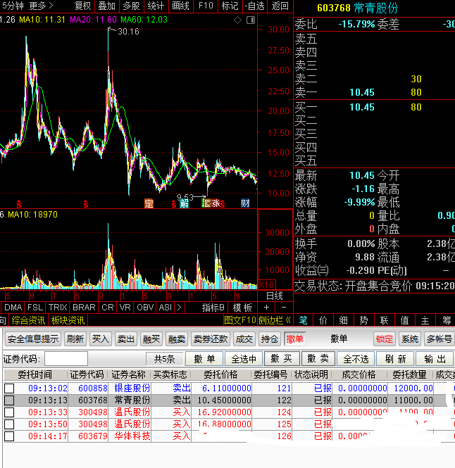 12月23竞价:常青股价110手跌停试庄,有资金秒拉板反击?看今天的单$温氏股份(SZ300498)$ $华体科技(SH603679)$ $银座股份(SH600858)$ 一会如何了。看年底搞点猪肉等超跌猪价回暖