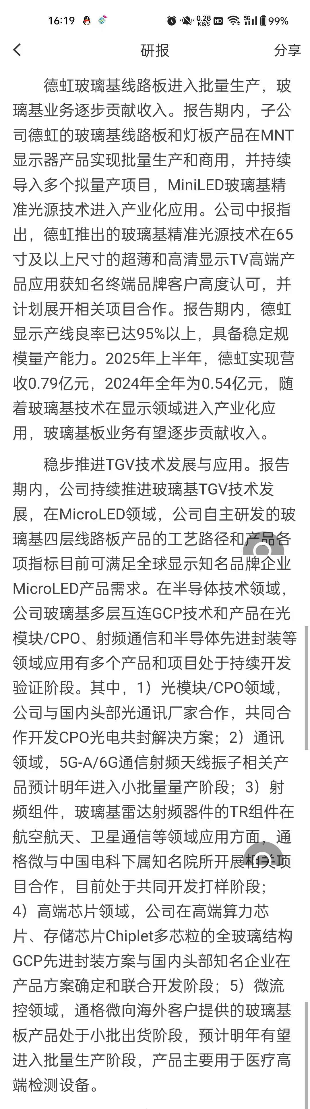 3)射频组件,玻璃基雷达射频器件的TR组件在航空航天、卫星通信等领域应用方面,通格微与中国电科下属知名院所开展相关项目合作,目前处于共同开发打样阶段;4)高端芯片领域,公司在高端算力芯、存储心片Chiplet多心粒的全玻璃结构GCP先进封装方案与国内头部知名企业在产品方案确定和联合开发阶段;