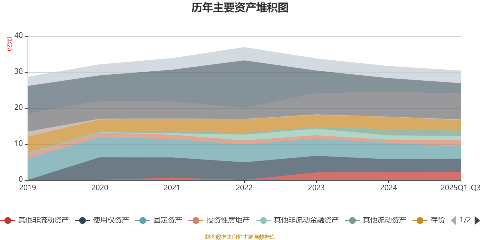 资产重大变化方面,截至2025年三季度末,公司固定资产较上年末减少25.78%,占公司总资产比重下降3.29个百分点;投资性房地产较上年末增加115.18%,占公司总资产比重上升3.23个百分点;货币资金较上年末减少24.02%,占公司总资产比重下降2.52个百分点;交易性金融资产合计较上年末增加4.02%,占公司总资产比重上升1.8个百分点。