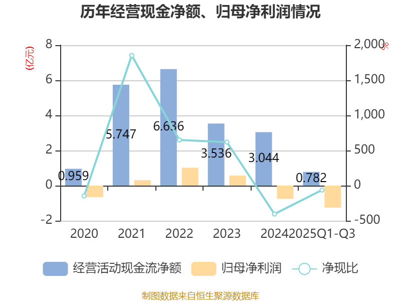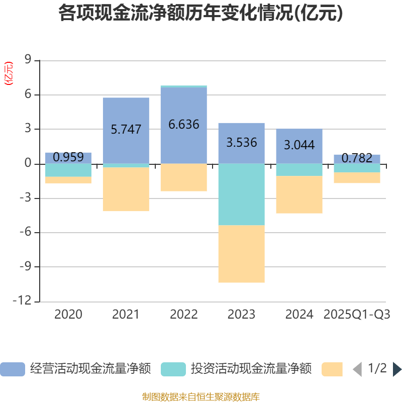 2025年前三季度,公司经营活动现金流净额为7822.14万元,同比下降64.52%;筹资活动现金流净额-9251.25万元,同比增加1.65亿元;投资活动现金流净额-7623.71万元,上年同期为-5190.58万元。