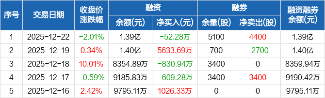 融资方面,当日融资买入4168.33万元,融资偿还4220.61万元,融资净偿还52.28万元。融券方面,融券卖出4400股,融券偿还0股,融券余量5100股,融券余额7.44万元。融资融券余额合计1.39亿元。