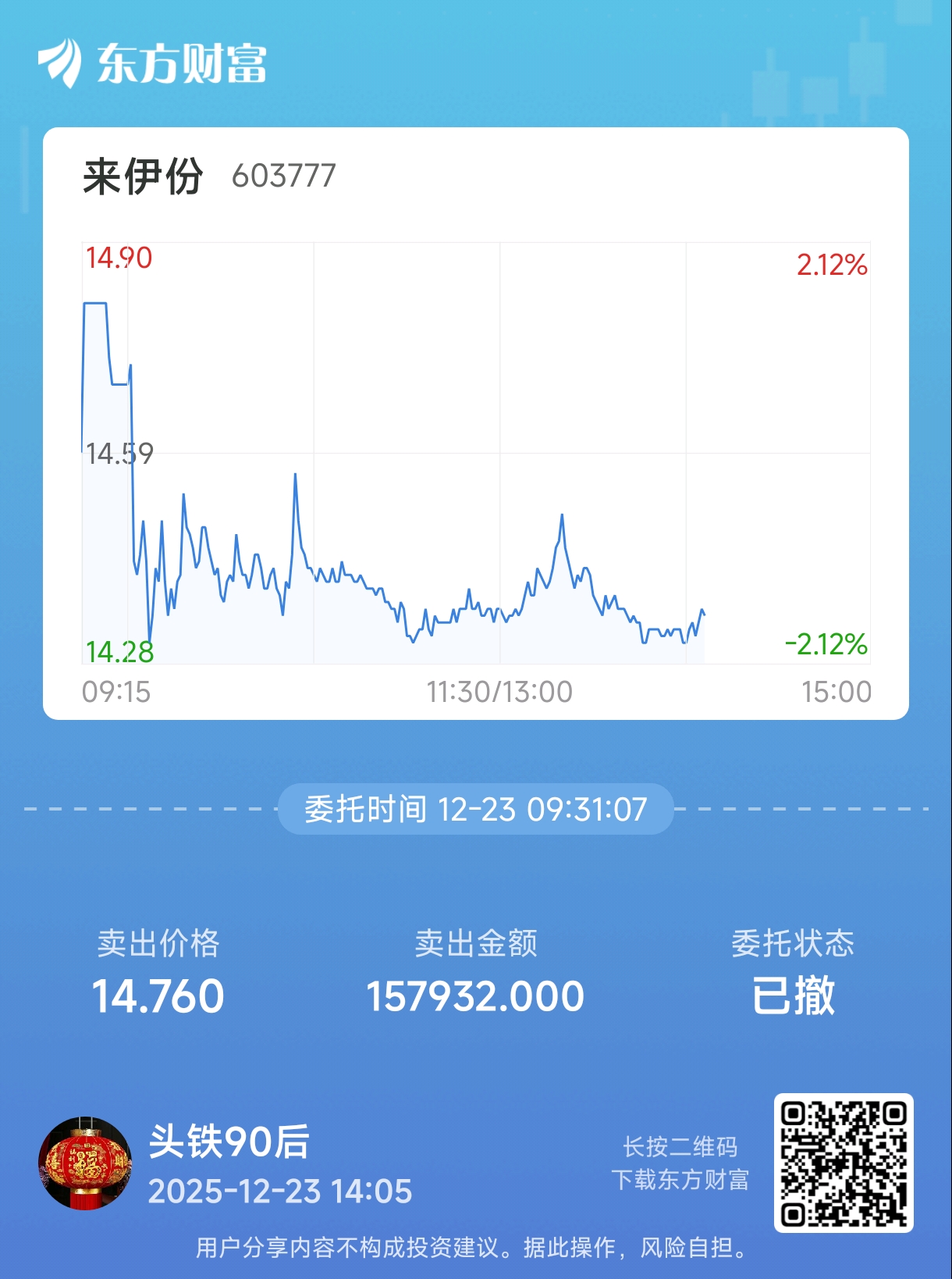连续两天没卖掉,早上一瞬间就掉下去了,被套3个点了委托标的:买卖方向:笔记: