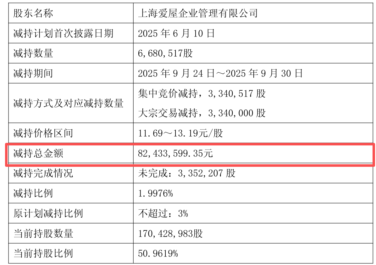 值得一提的是,爱屋企管刚于2025年9月24日至2025年9月30日减持了668.05万股,约占公司总股本的2%,套现8243.36万元。