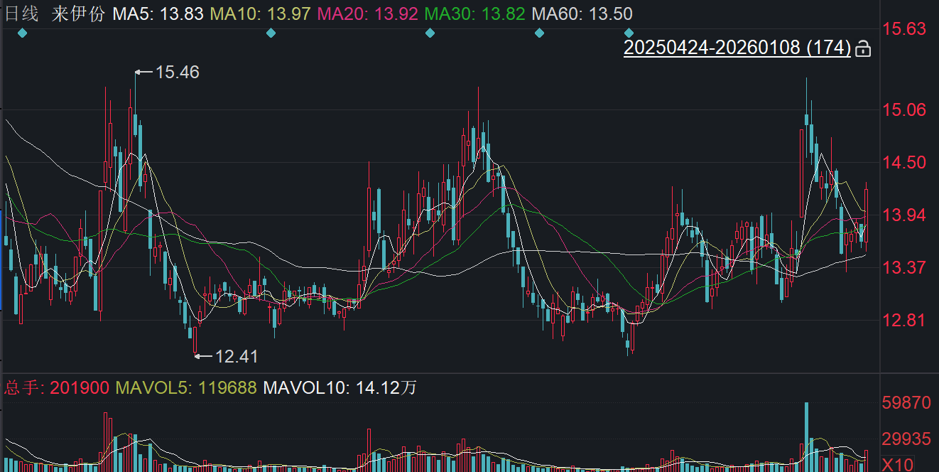 二级市场上,截至1月8日收盘,来伊份上涨4.11%报14.20元/股,总市值约47.49亿元,近一年公司股价近乎“原地踏步”。