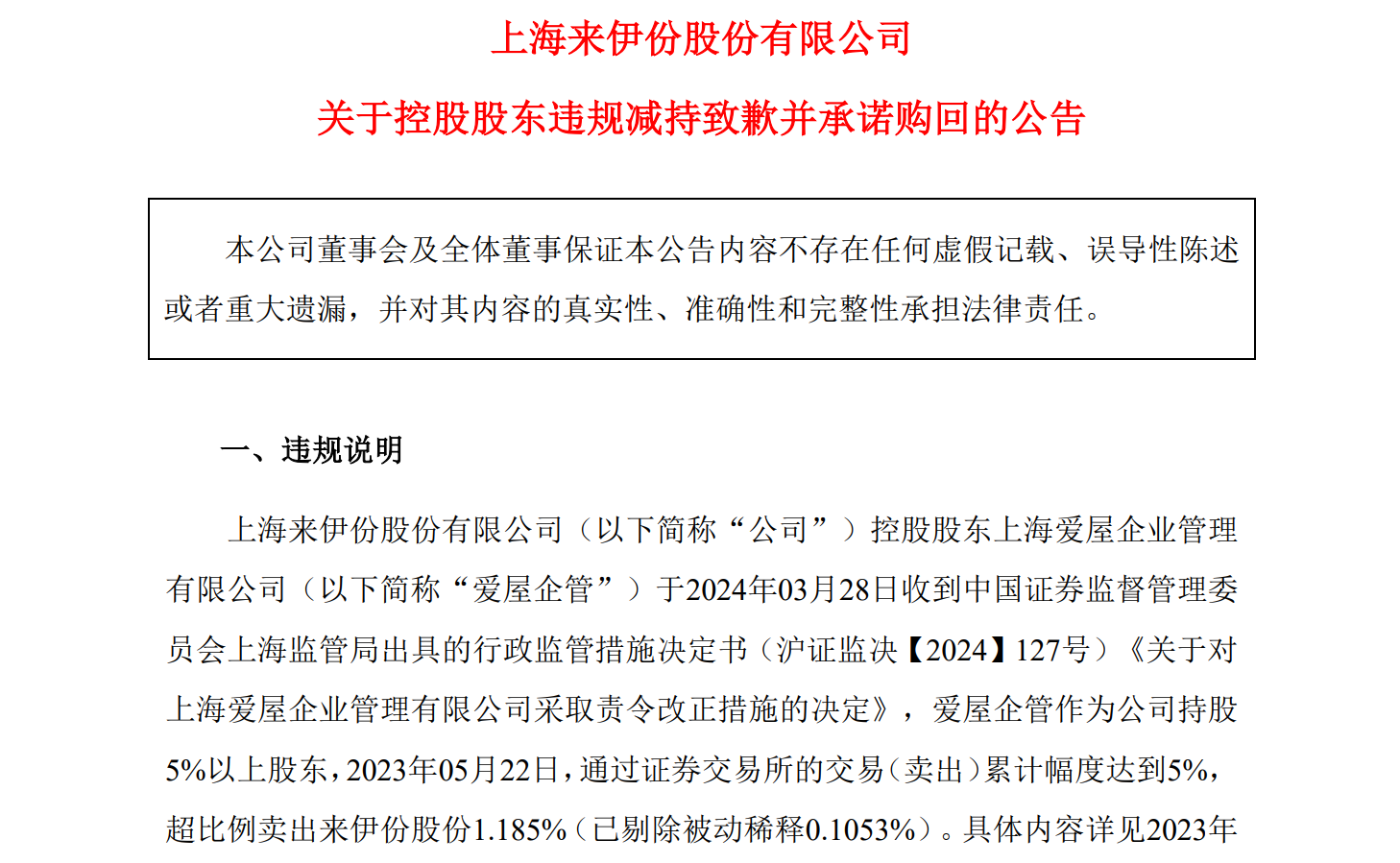 爱屋企管致歉并承诺回购,并承诺将购回股票产生的收益全部归上市公司来伊份所有。这也是至今,爱屋企管一系列减持中,不得不在2024年4月进行“被动增持”。