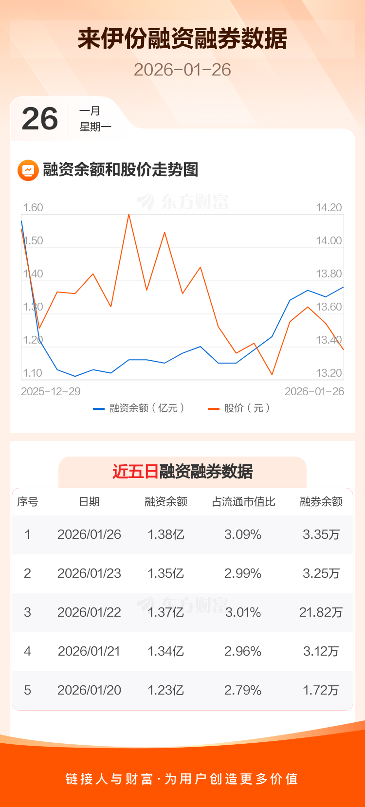 交易所最新数据显示,来伊份于2026年1月26日获融资买入861.71万元,融资偿还588.95万元,当日融资净买入272.76万元。目前,该股融资余额1.38亿,占流通市值比例为3.09%。