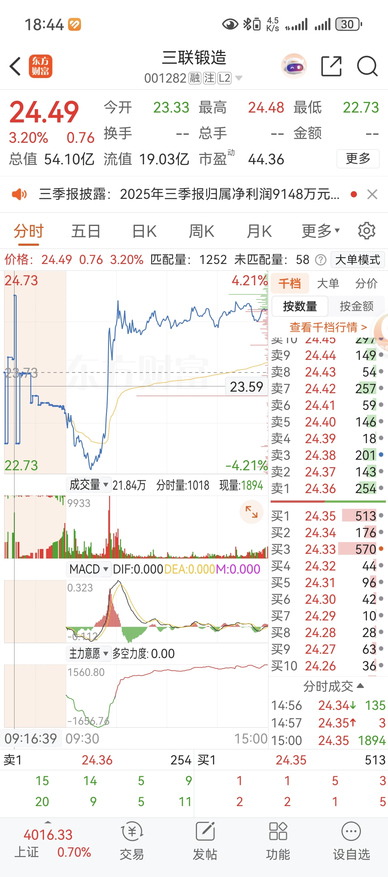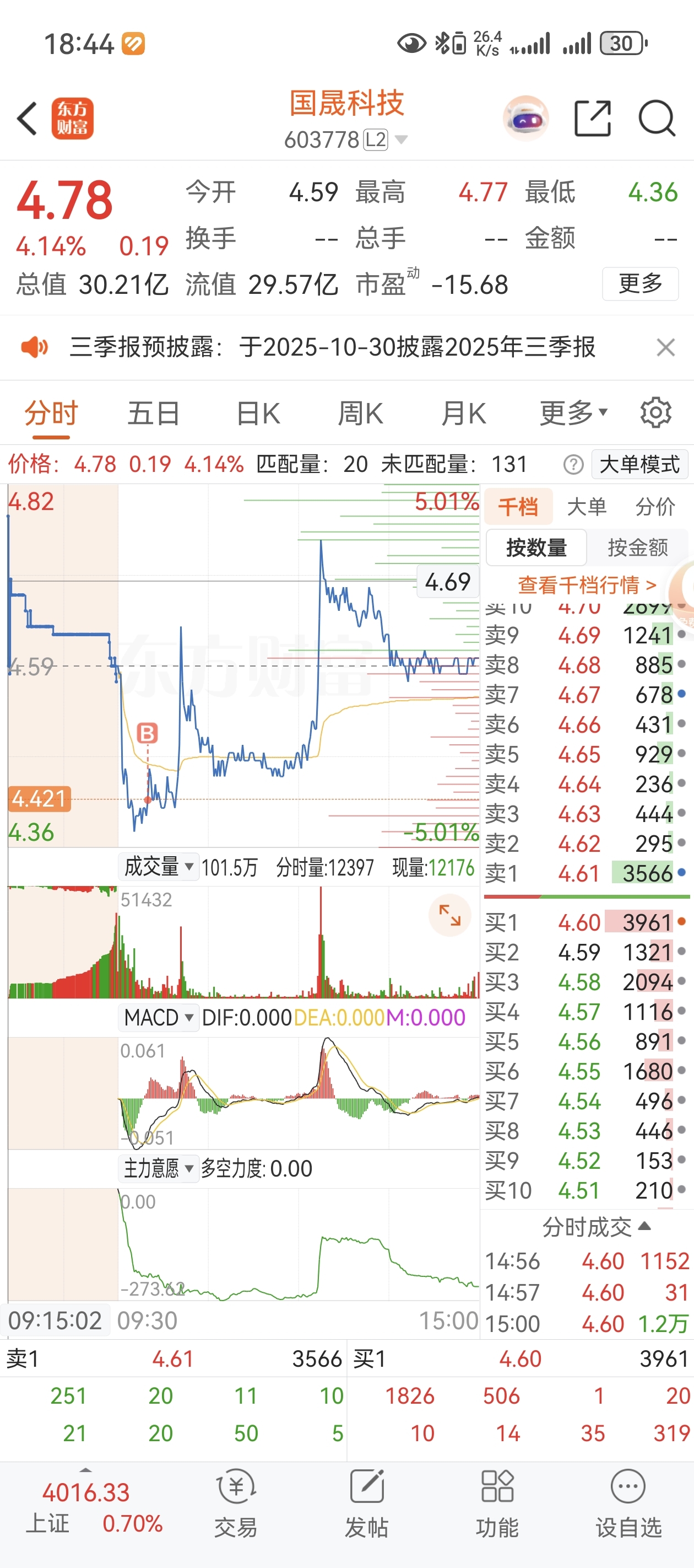 三联集合竞价试盘24.49,拉升最高24.48。国竞价试盘4.78,拉升4.77