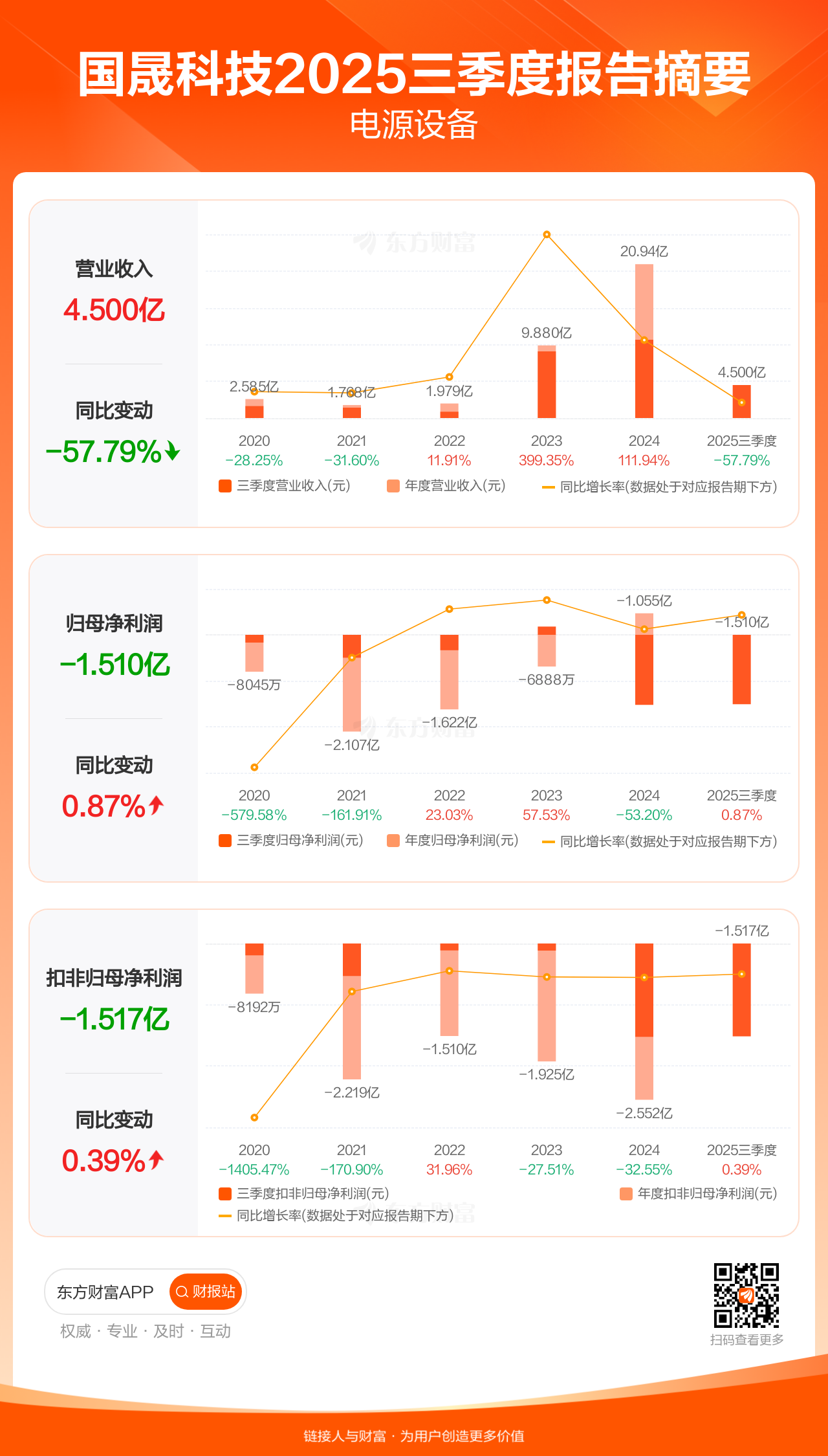 国晟科技10月30日发布2025年三季报显示,公司前三季实现营业收入4.50亿元,同比下滑57.79%;归母净利润-1.51亿元;扣非归母净利润-1.52亿元