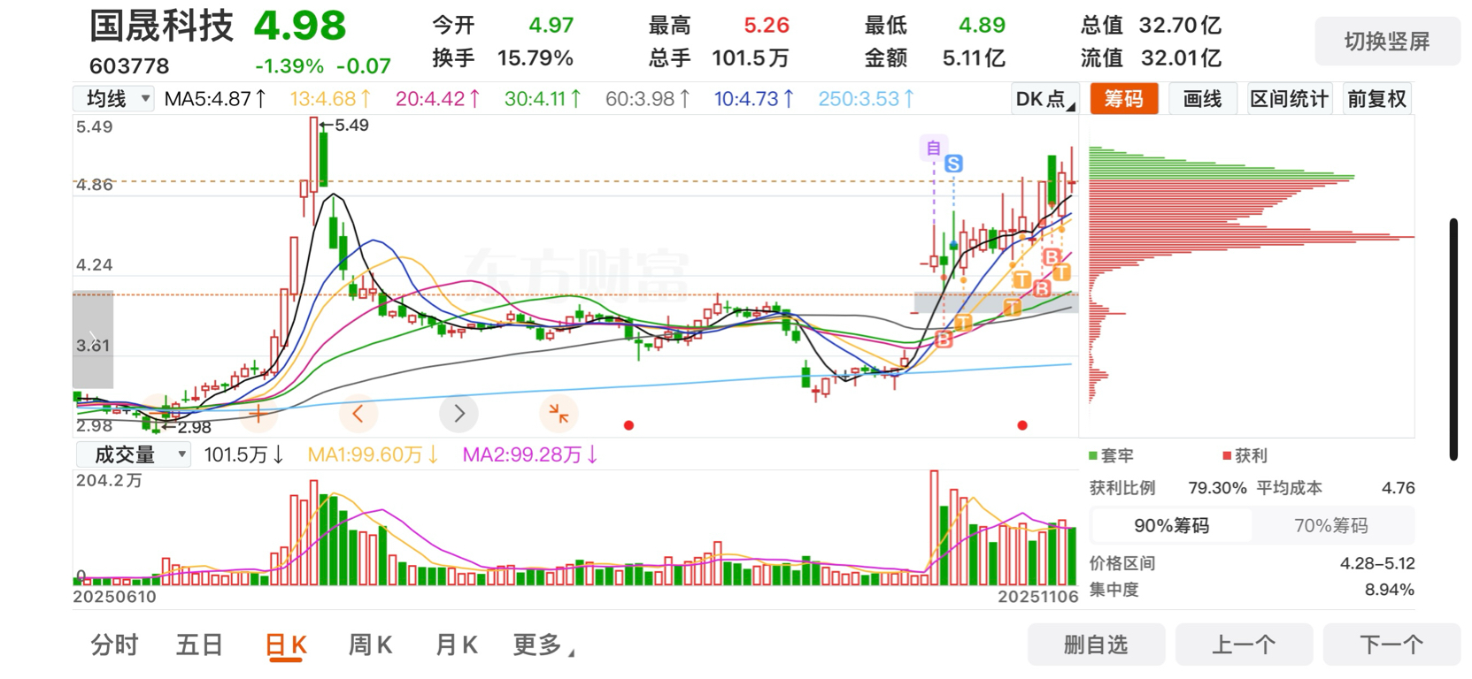 $国晟科技(SH603778)$ 怎么都骂多多呢,不是都赚钱的吗,哪天买的?现在这点位获利盘占多数呀。套的没几个吧。有机会就T一下,一般都做正T,反T怕随时T飞,今天挂的4.88低了一分钱没成交,今天就没动,虽然明天再调整一天的可能很大,也怕他突然又拉上去了,现在趋势还是没变的