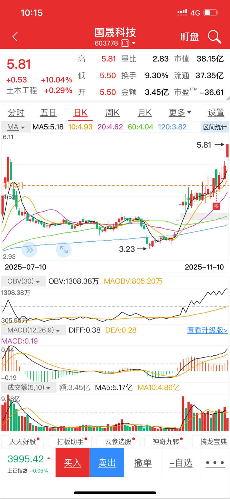 $国晟科技(SH603778)$ 我是乌云盖顶那天最后尾盘上车的,可见我的盘感有多好,作为技术派,我一直在强调五日十日线就是这波上涨的支撑位