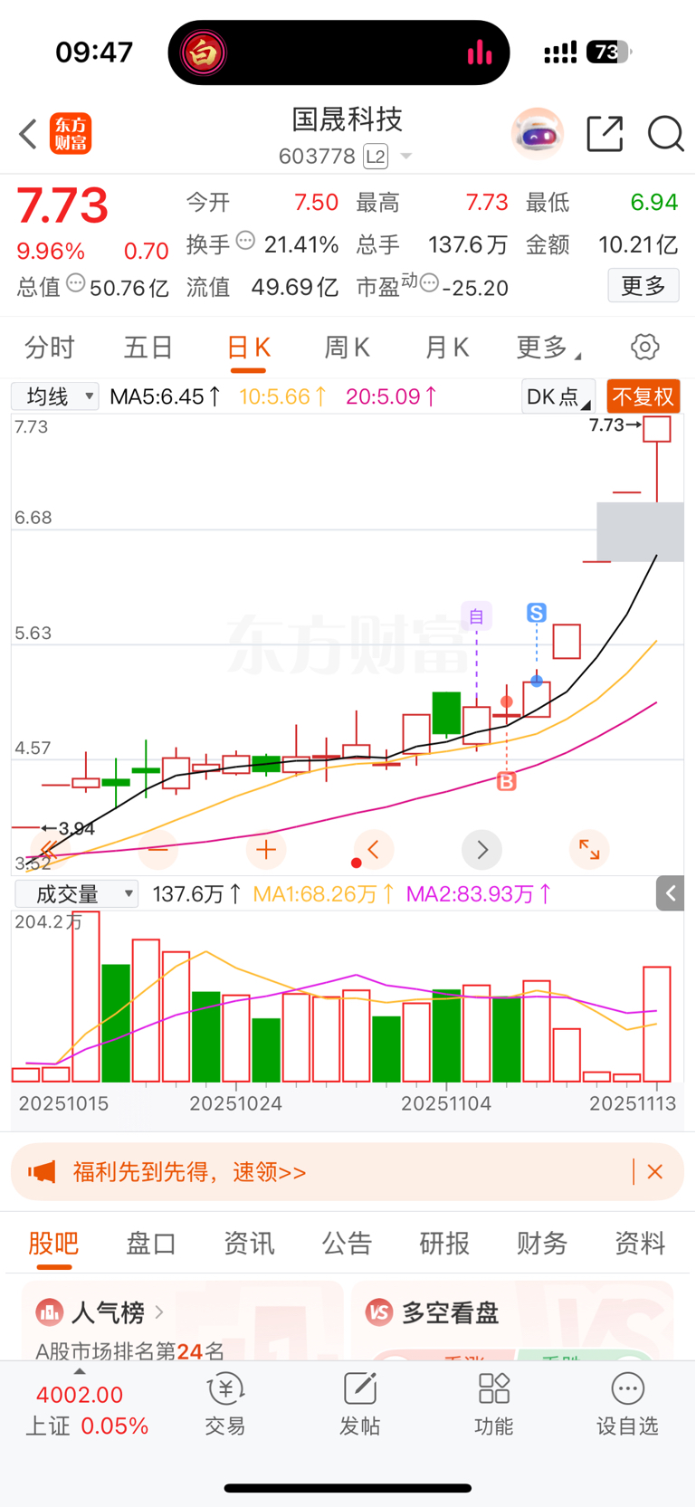 $国晟科技(SH603778)$ 人生能遇到几个三连板,但是我已经错过一个