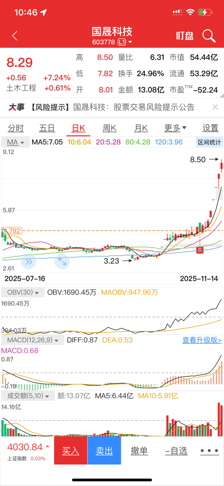 $国晟科技(SH603778)$ 答应兄弟们的我就一定会说说我的看法,下午涨停就继续持有,下午尾盘还是拉不上去,就出绝不留念!我目前的看法就是高位的第二个换手板,但是一切都取决于它下午的表现!符合预期就留,不符合预期就出局!如果出局了,下周它继续板,我也认,我只赚我认知以内的钱