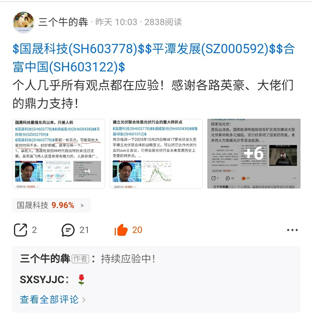 本人首次发贴诞生过很多翻倍股甚至多倍股。第二天有一半的概率涨停,有南都电源、香雪制药、来伊份、永安药业、红墙股份、幸福蓝海.......包括9月18日晚发的深圳新星,包括9月22日晚发的泰和科技,包括10月31日晚发的国晟科技第二天就涨停了,太多了。国晟科技硬核逻辑强大(翻我以前的帖子),体质优越,恰逢11月中旬离跨年较近。这次希望借着光伏超跌4年、建立光伏联合体、国家绿能政策和世界能源趋势的东风和各路英雄豪杰、大佬们一起打造一个A股传奇,在A股历史上留下最厚重也最浪漫的一页!一起,兄弟们,少你一个都不行!有人说A股是互相掏口袋,但在我这里不是,我的目标是和大家一起享受逻辑和发展带来的时代红利,而不是零和博弈!