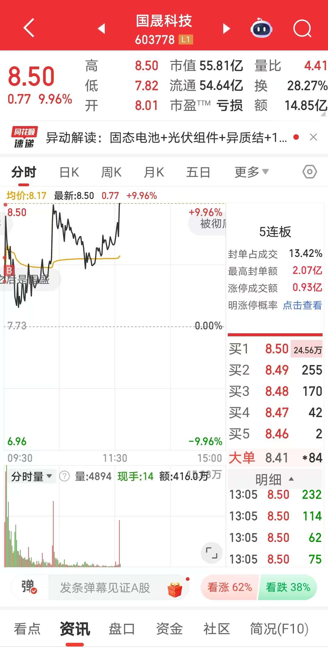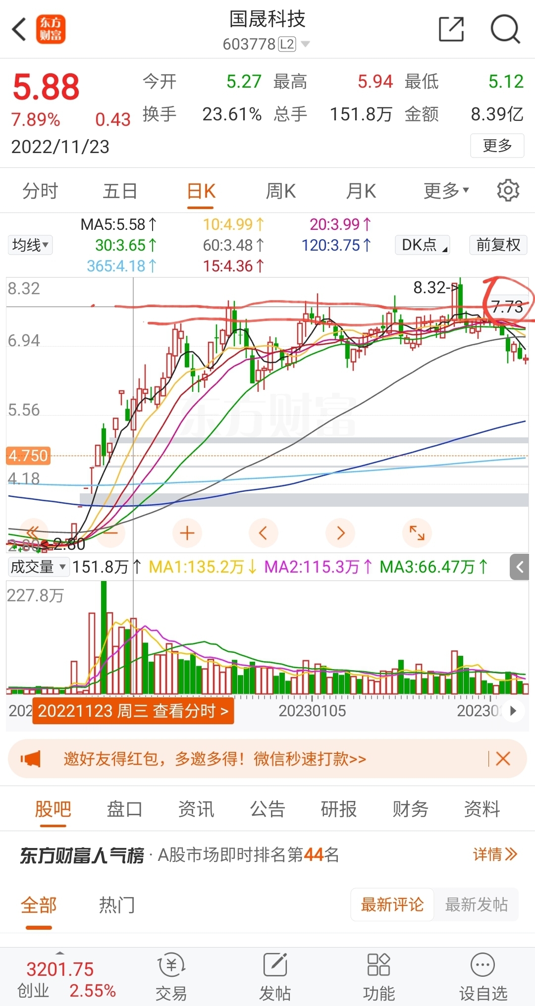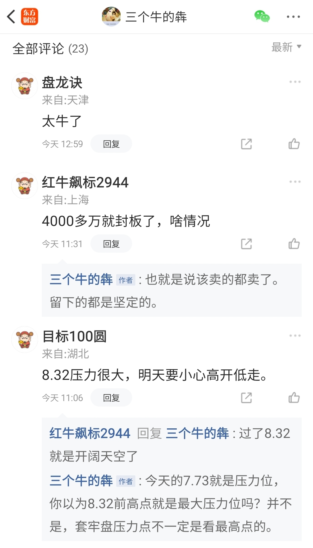 但是我告诉的是,7.5~7.73元才是压力最大的区间,压力远高于8.32。能在7.73顶住巨大的前期套牢盘压力封板,已经给出了明确的答案,最大的压力都不是压力。那么今天的压力必然会转化为明天的动力。